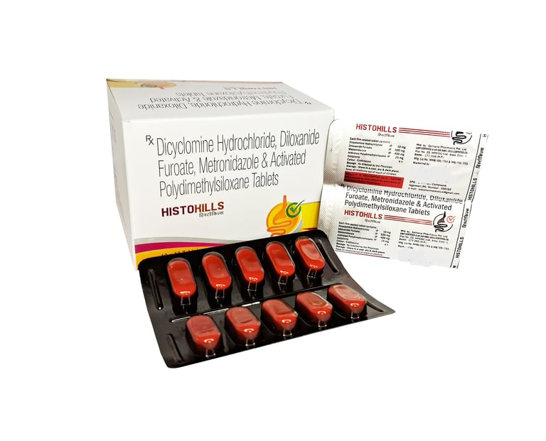 Dicyclomine Hydrochloride 10 mg, Diloxanide Furoate 500 mg, Metronidazole 400 mg and Polydimethylsiloxane 25 mg Tablets