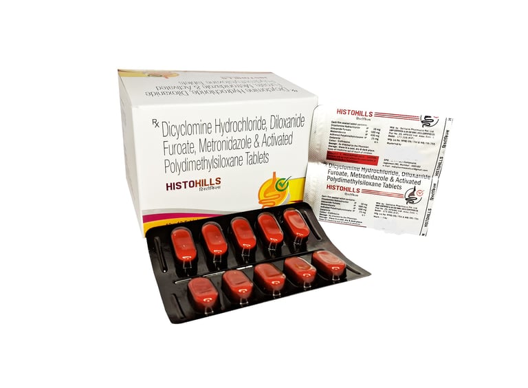 HISTOKILLS is used for the treatment of intestinal and extra-intestinal amoebiasis as well as general diarrhea caused by infections. Diloxanide Furoate acts as a luminal amoebicide, eliminating amoebas in the intestines, while Metronidazole is an antiprotozoal and antibacterial agent that targets amoebas in both intestinal and extra-intestinal infections, including liver abscesses. Dicyclomine Hydrochloride helps relieve abdominal cramps by relaxing intestinal muscles, and Polydimethylsiloxane reduces bloating and discomfort by preventing excessive gas formation. This combination provides comprehensive relief by addressing both the cause and symptoms of amoebiasis and infectious diarrhea.