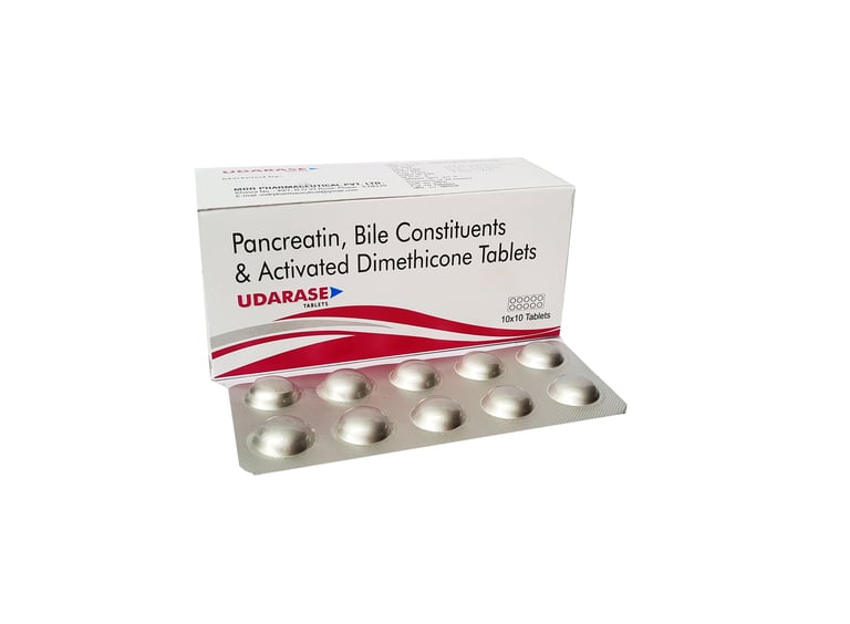 Pancreatin, bile constituents, and dimethicone are formulated to aid digestion and relieve gastrointestinal discomfort. Pancreatin is a mixture of digestive enzymes (amylase, protease, and lipase) that help break down carbohydrates, proteins, and fats. Bile constituents assist in fat digestion and absorption, improving overall digestion. Dimethicone is an anti-foaming agent that helps reduce bloating and discomfort caused by excess gas in the stomach and intestines. Together, these components effectively manage indigestion, bloating, and pancreatic insufficiency.
